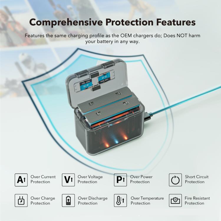 این محصول علاوه بر شارژر، بهعنوان یک قاب محافظ نیز عمل میکند و از باتریها هنگام حملونقل محافظت میکند.