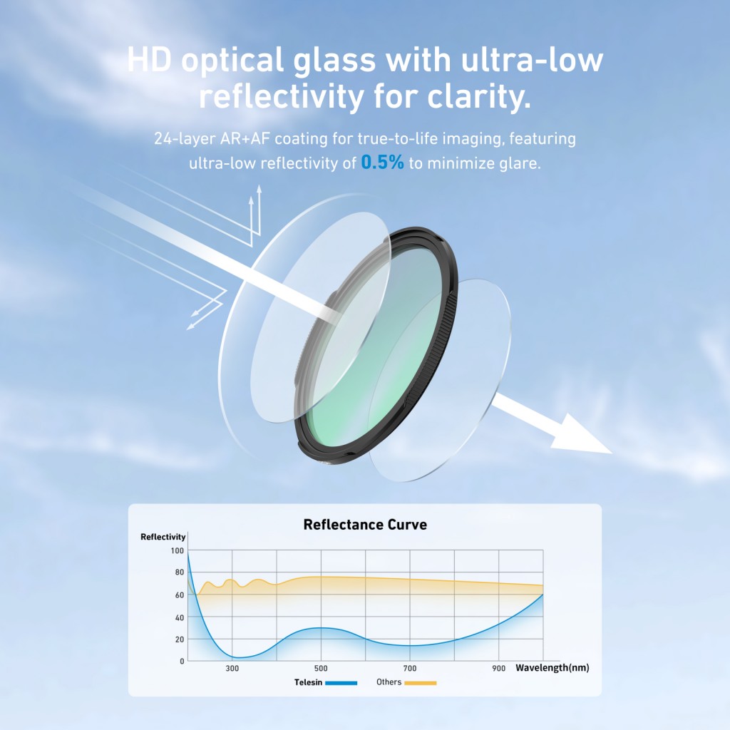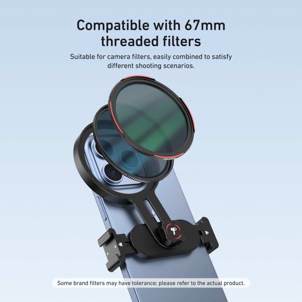 در قسمت جلویی این نگهدارنده، رزوهی دقیق ۶۷ میلیمتری تعبیه شده است که امکان نصب فیلترها و لنزهای حرفهای مانند ND، CPL، UV، ماکرو، و واید را فراهم میکند. به کمک این قابلیت میتوانید نور ورودی، انعکاسها و رنگها را بهصورت حرفهای کنترل کرده و تصاویری با وضوح بالا و رنگهای زنده ثبت کنید.