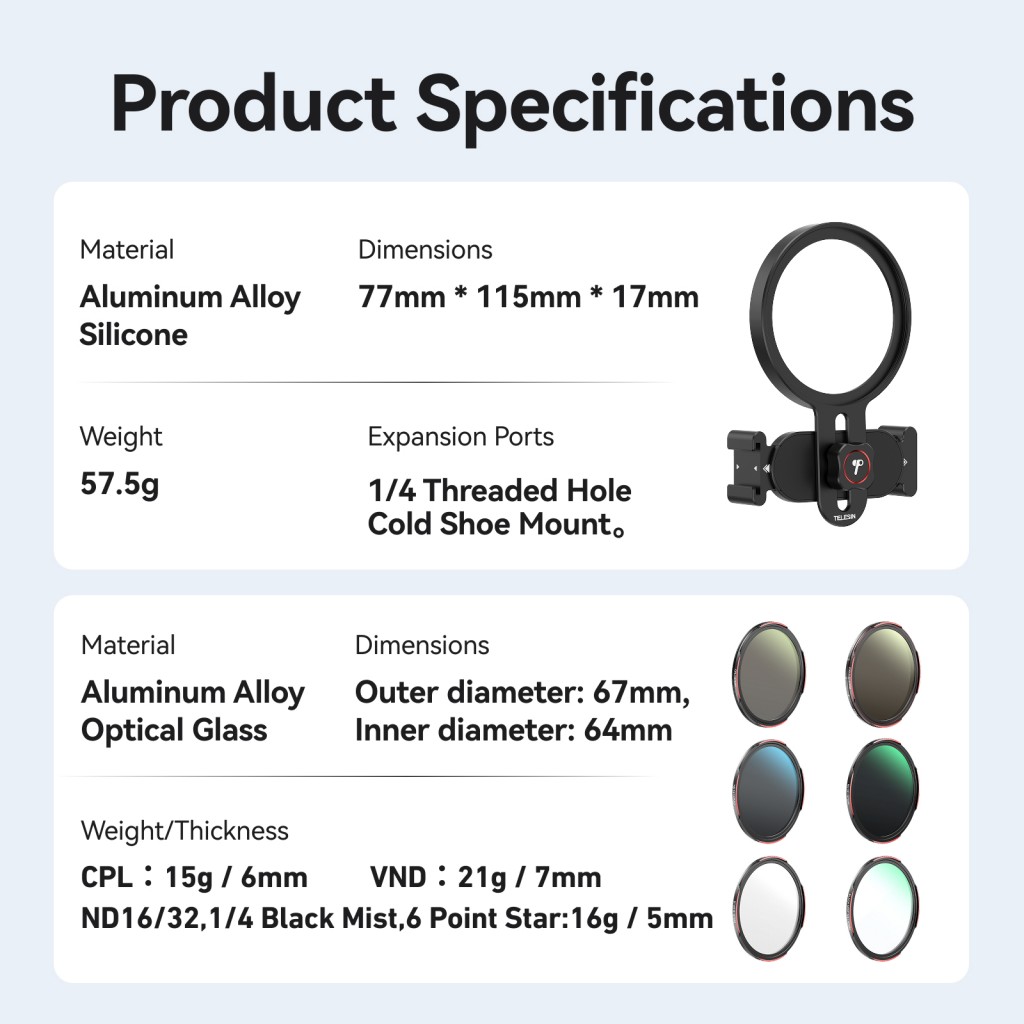 برند تلسین (TELESIN) همواره به کیفیت و نوآوری مشهور است. این نگهدارنده به شما امکان میدهد گوشی هوشمندتان را به یک دوربین حرفهای تبدیل کنید. با استفاده از لنز ۶۷ میلیمتری میتوانید جلوههای بصری خیرهکنندهای خلق کنید و محدودیتهای دوربین موبایل را پشت سر بگذارید.